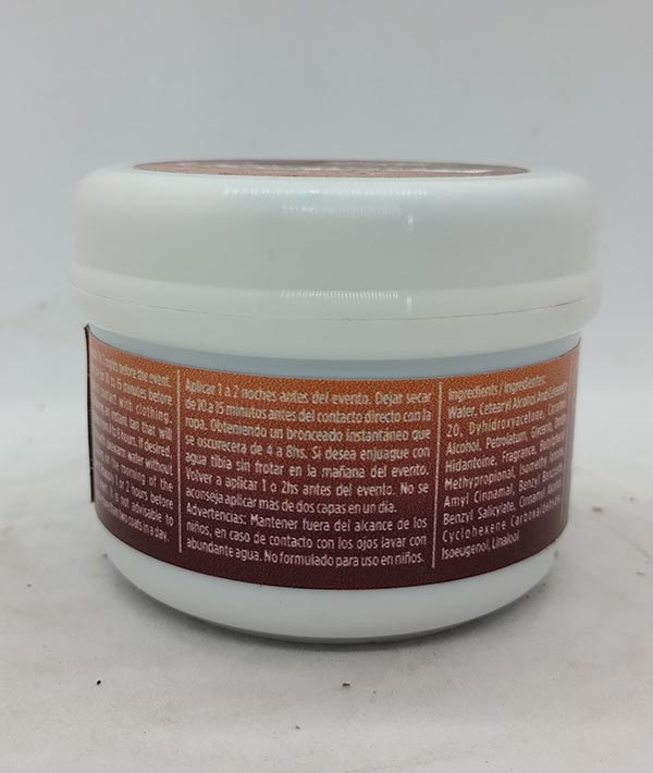 Aplicar 1 a 2 noches antes del evento. Dejar secar de 10 a 15 minutos antes del contacto directo con la ropa. Obteniendo un bronceado instantáneo que se oscurecerá de 4 a 8 hs. Si desea, enjuague con agua tibia sin frotar en la mañana del evento. Volver a aplicar 1 o 2 hs antes del evento. No se aconseja aplicar mas de dos capas en un día.