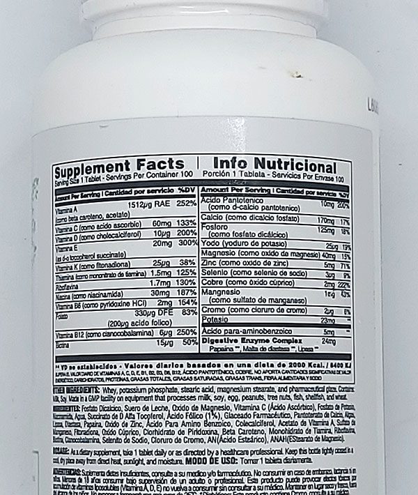 Envase de 100 comprimidos. Sin sabor agregado.