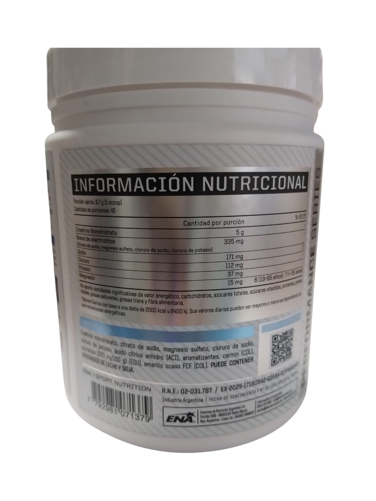 Aporta 5 g de creatina monohidratada micronizada por porción junto con un blend balanceado de electrolitos (sodio, potasio, magnesio y cloruro), que ayuda a sostener la función muscular y evitar calambres, fatiga y falta de sales minerales.
