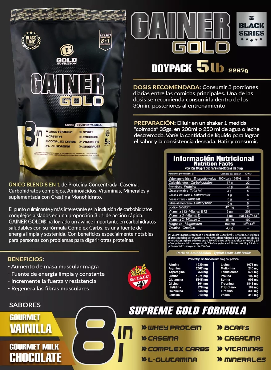 GAINER GOLD Es un auténtico gainer, un potenciador físico y un máximo recuperador muscular creado bajo las estrictas demandas físicas de atletas profesionales.